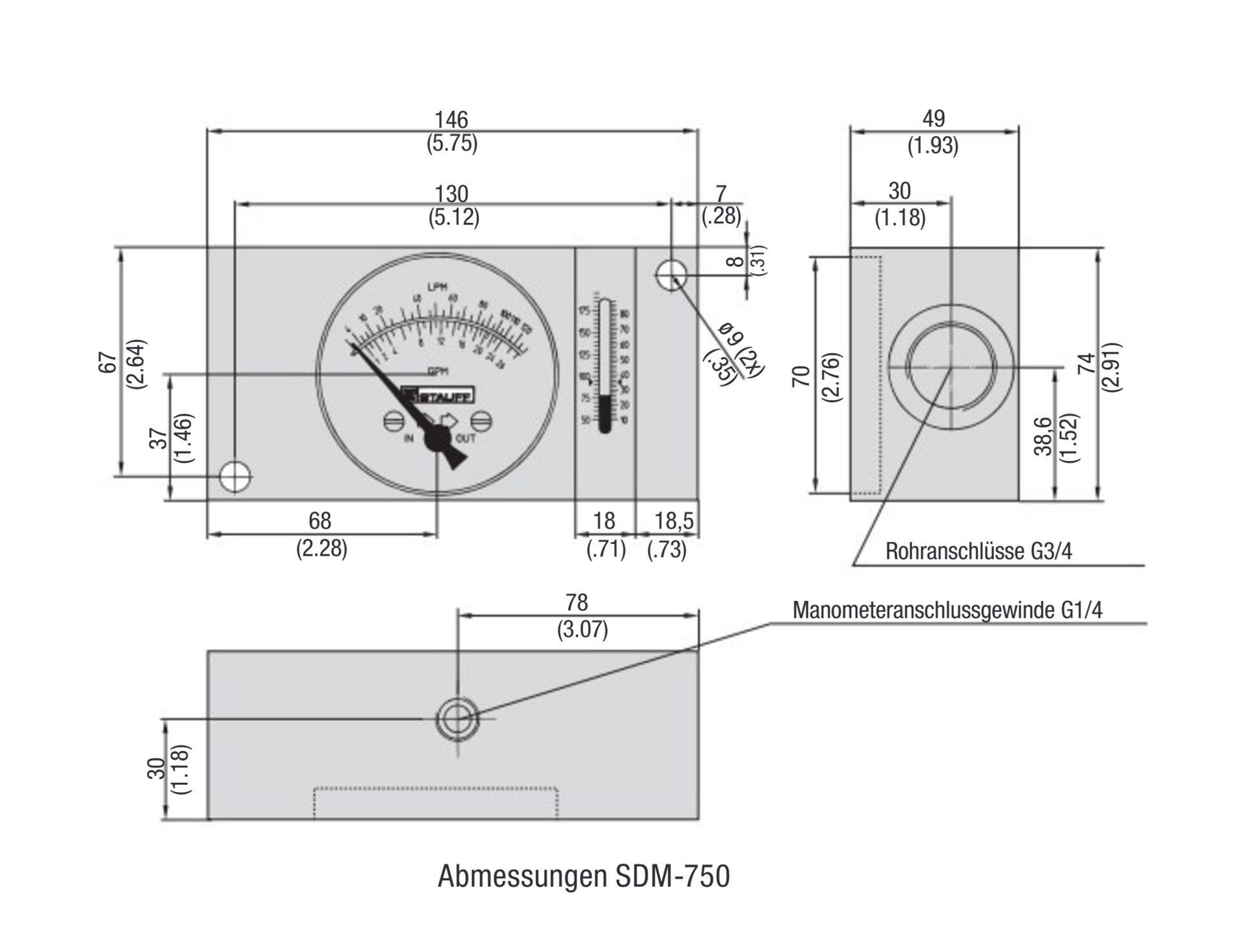 Mit einer doppelten Skala für l/min und gpm (Gallons per minute).