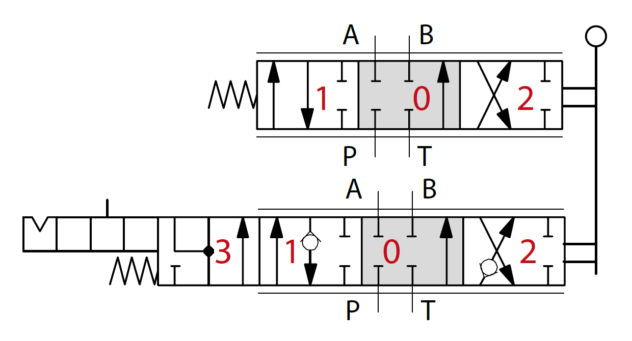 Es hat wahlweise zwei doppeltwirkende oder eine einfachwirkende und eine doppeltwirkende Sektion. Außerdem kann es optional mit Druckweiterleitung ausgeliefert werden, wenn weitere nachgelagerte Steuerblöcke versorgt werden müssen.