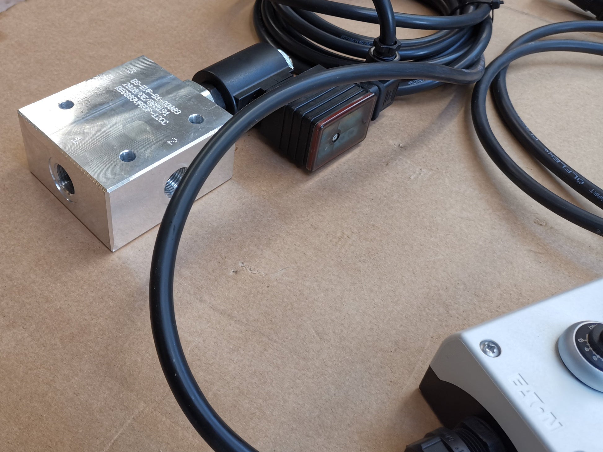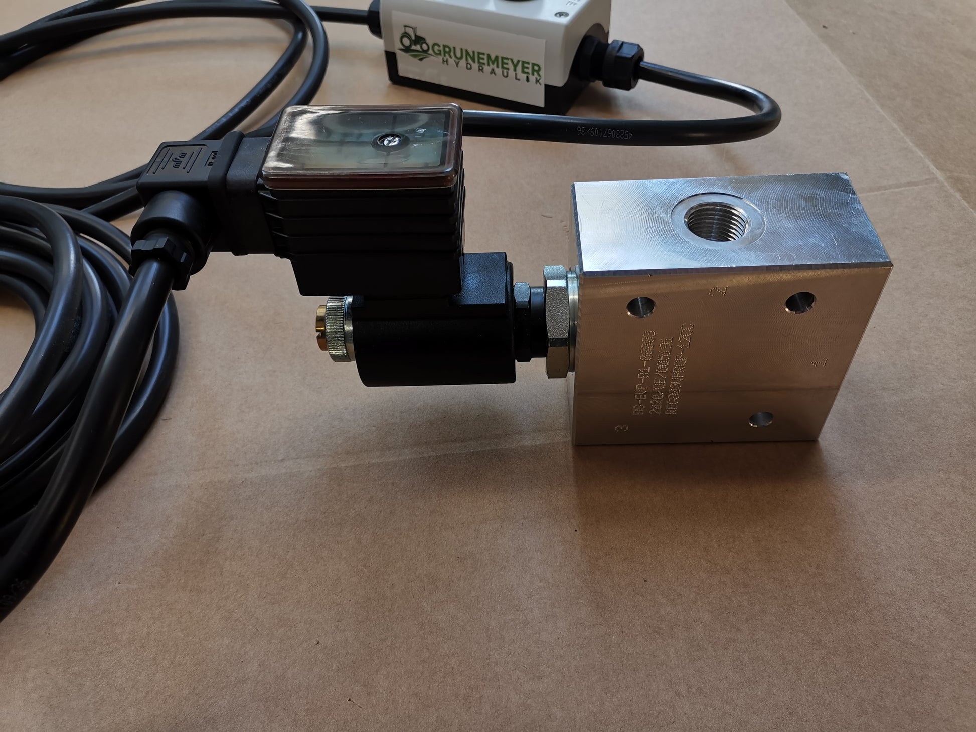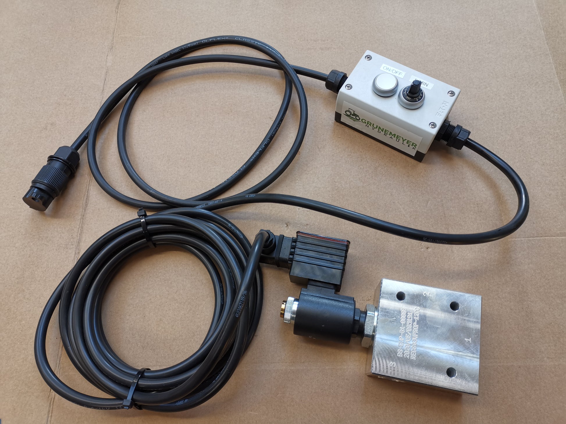 Im Angebot enthalten ist außerdem die 2m Zuleitung mit dreipoligem Stecker und ein 5m Zuleitungskabel zwischen Einstellbox und dem Stromregelventil.