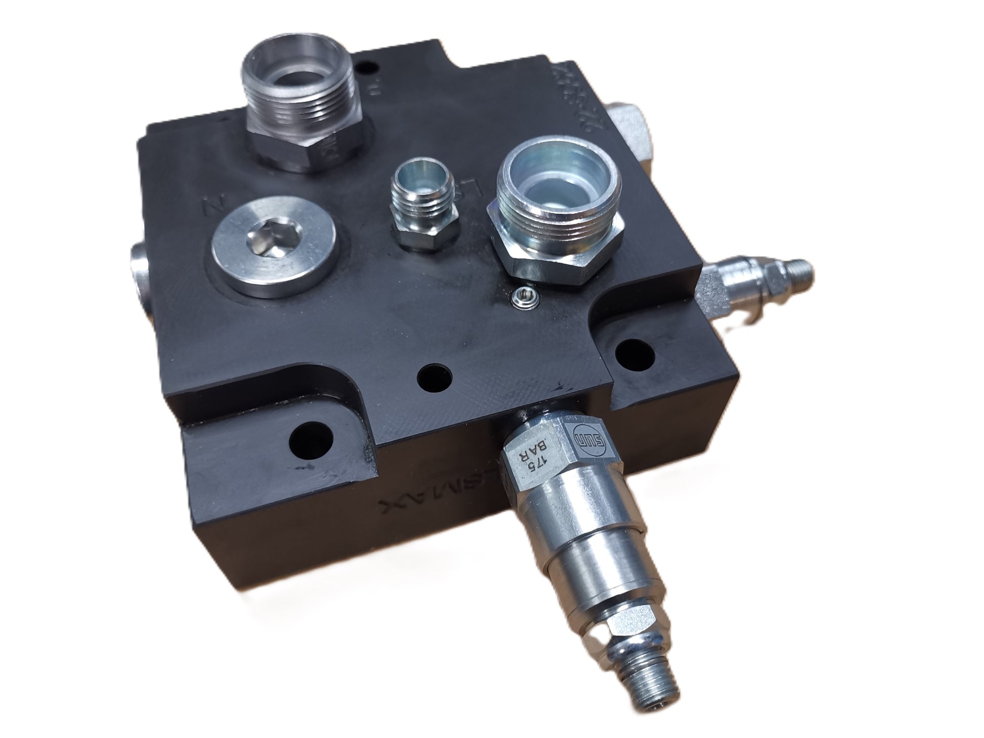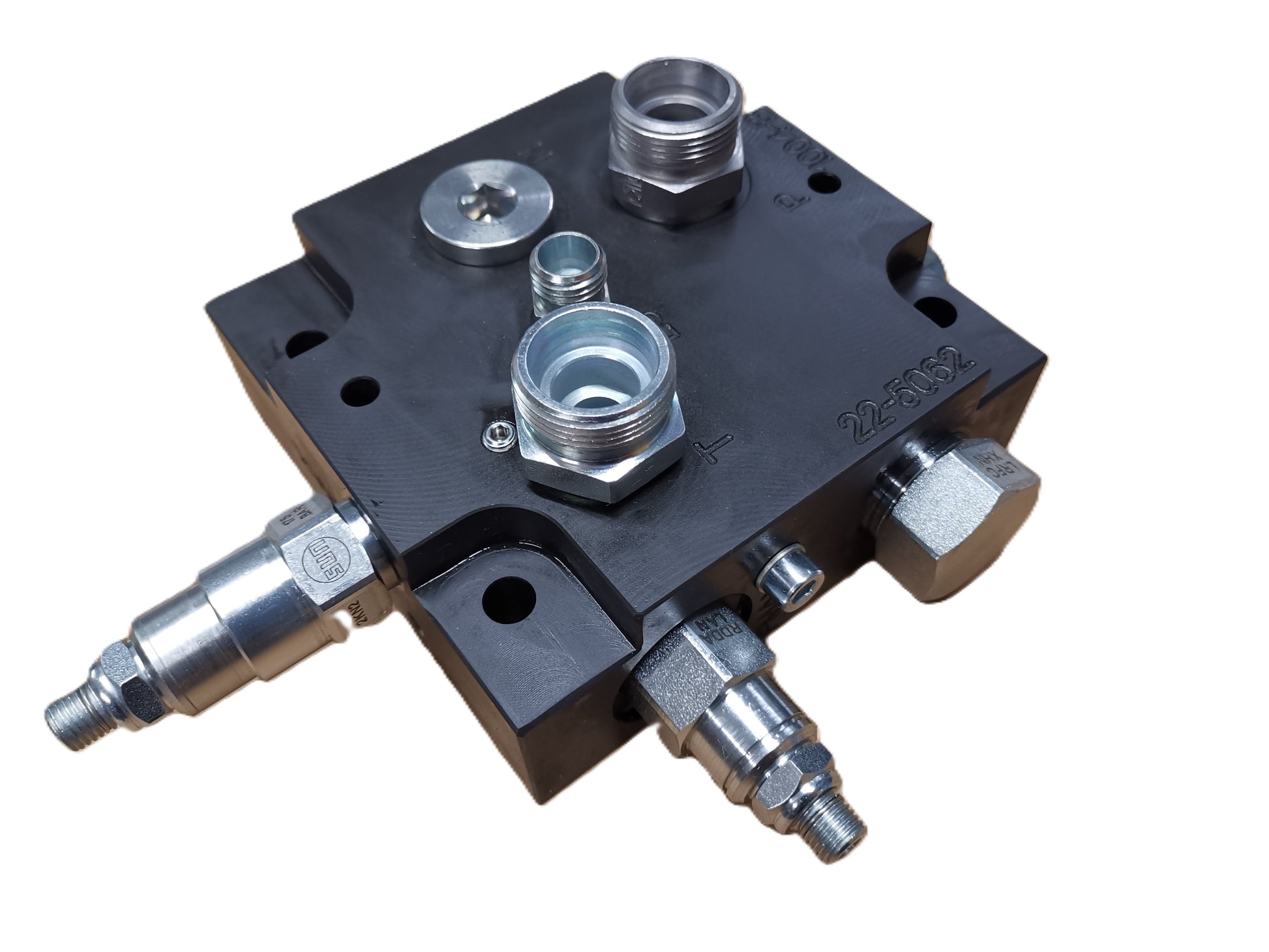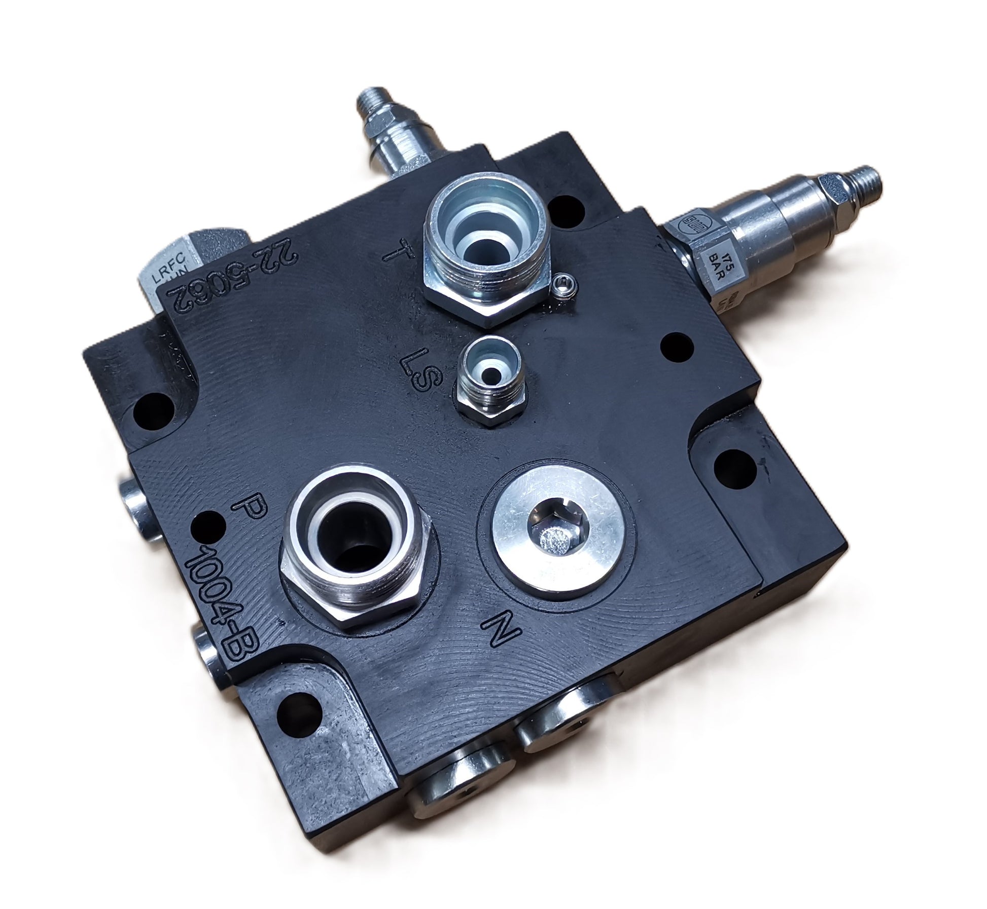 Die Endplatte enthält ein großes Haupt-Druckbegrenzungsventil und ein Druckbegrenzungsventil für das LS-Signal.