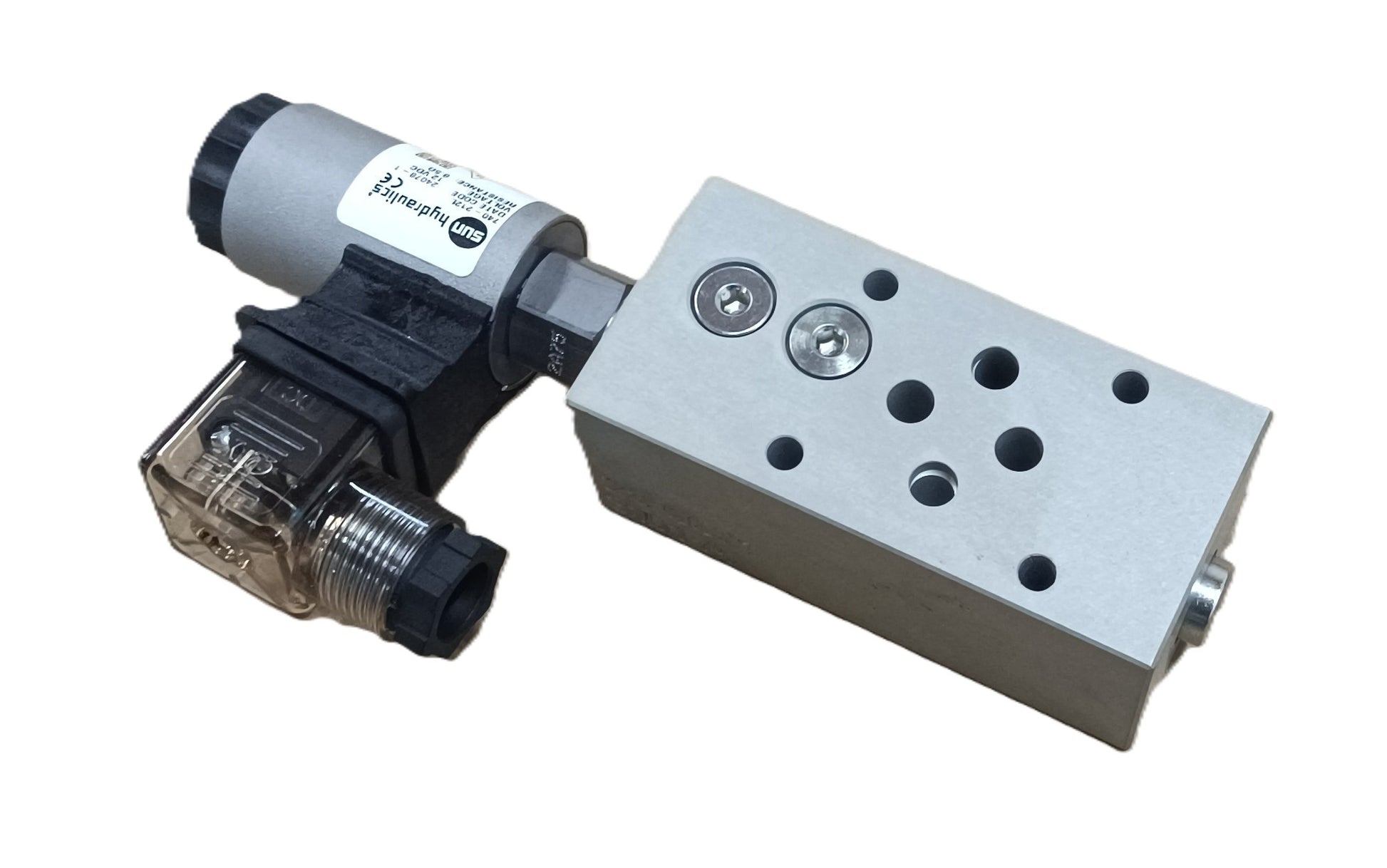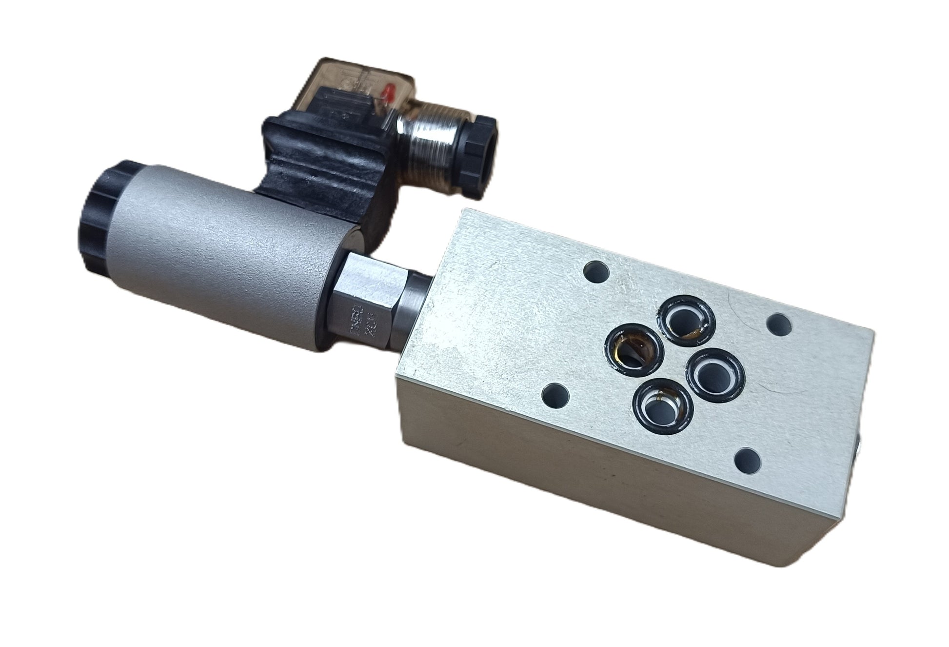 Diese Zwischenplatte mit integriertem Wegeventil lässt sich mit längeren Schrauben unter jedes Cetop NG06 Ventil montieren.